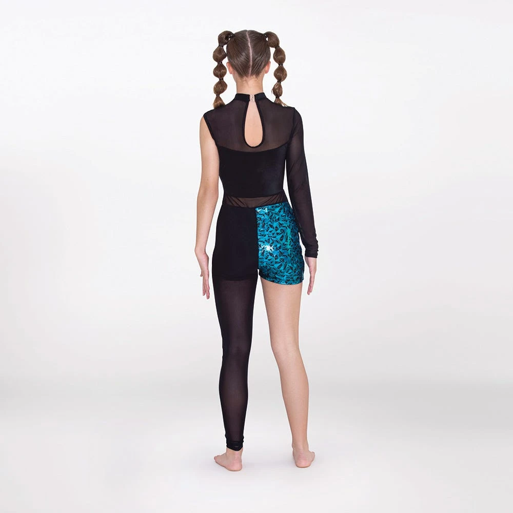 - Set pulses racing in this daring and unique geometric panelled catsuit from 1st Position. Metallic foil print, mesh yoke, long mesh sleeve and a single long mesh full leg sets this costume and you apart on stage.