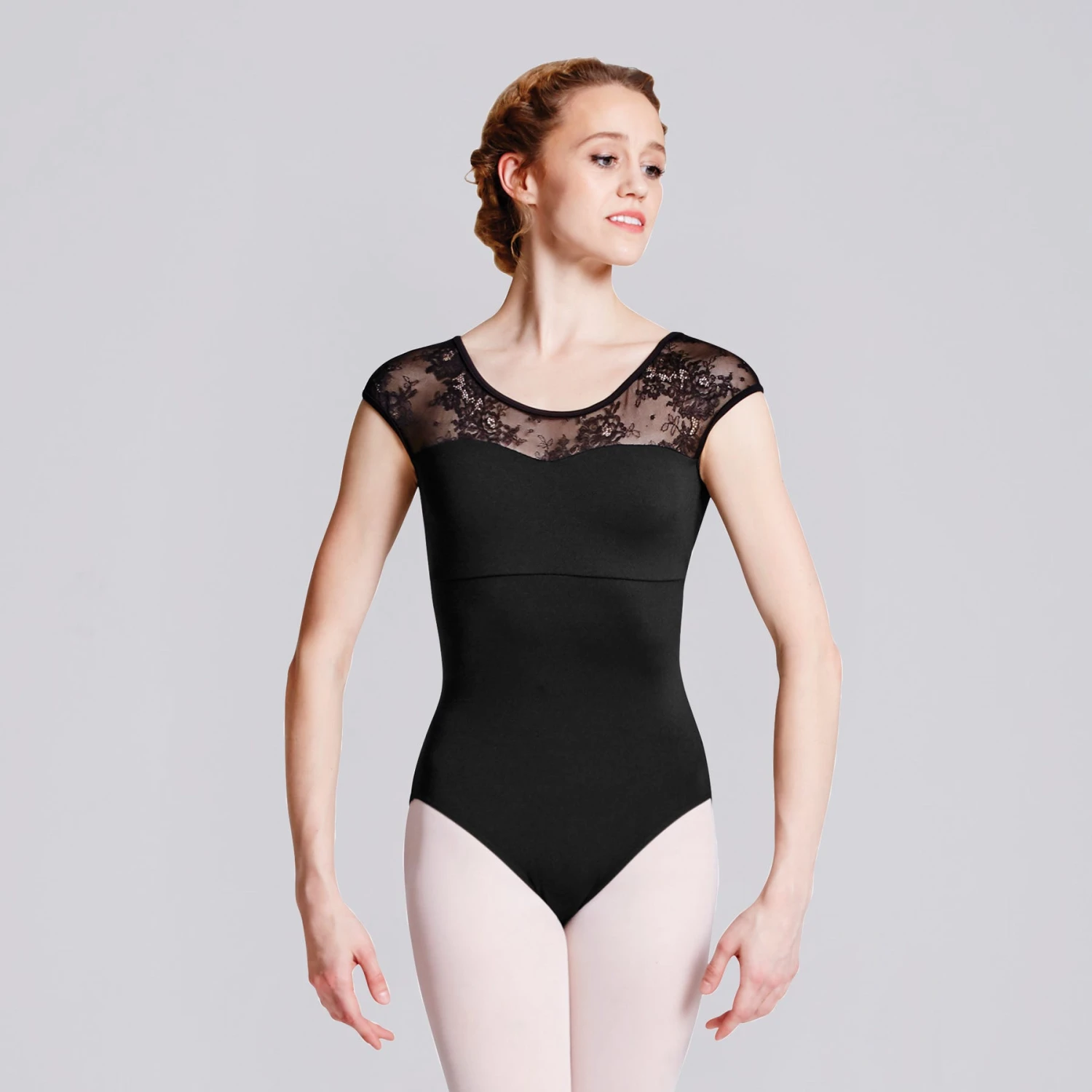 * This cap sleeved leotard has a lace and ribbon panelled back and front sweetheart neckline.