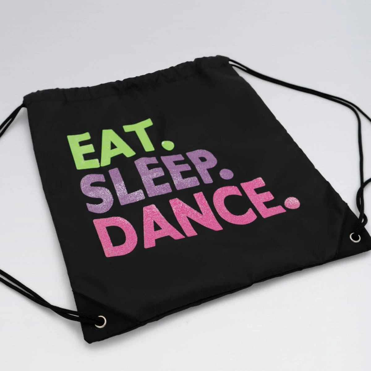 - Neon sparkle EAT. SLEEP. DANCE. lettering sets apart this bag